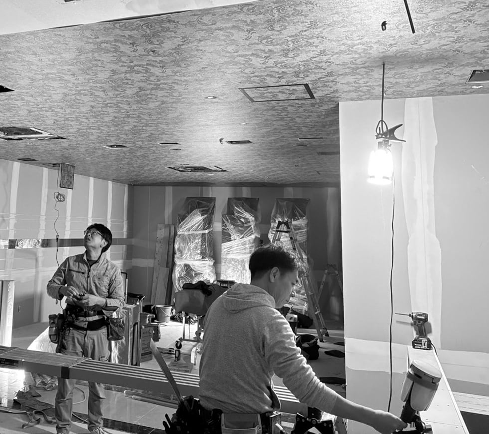 天井にはほこりやチリの落下防止や明るさの調整など様々な役割があります。天井が剥がれ落ちたりすると被害が大きくなるため、細心の注意をもって内装仕上を行います。
